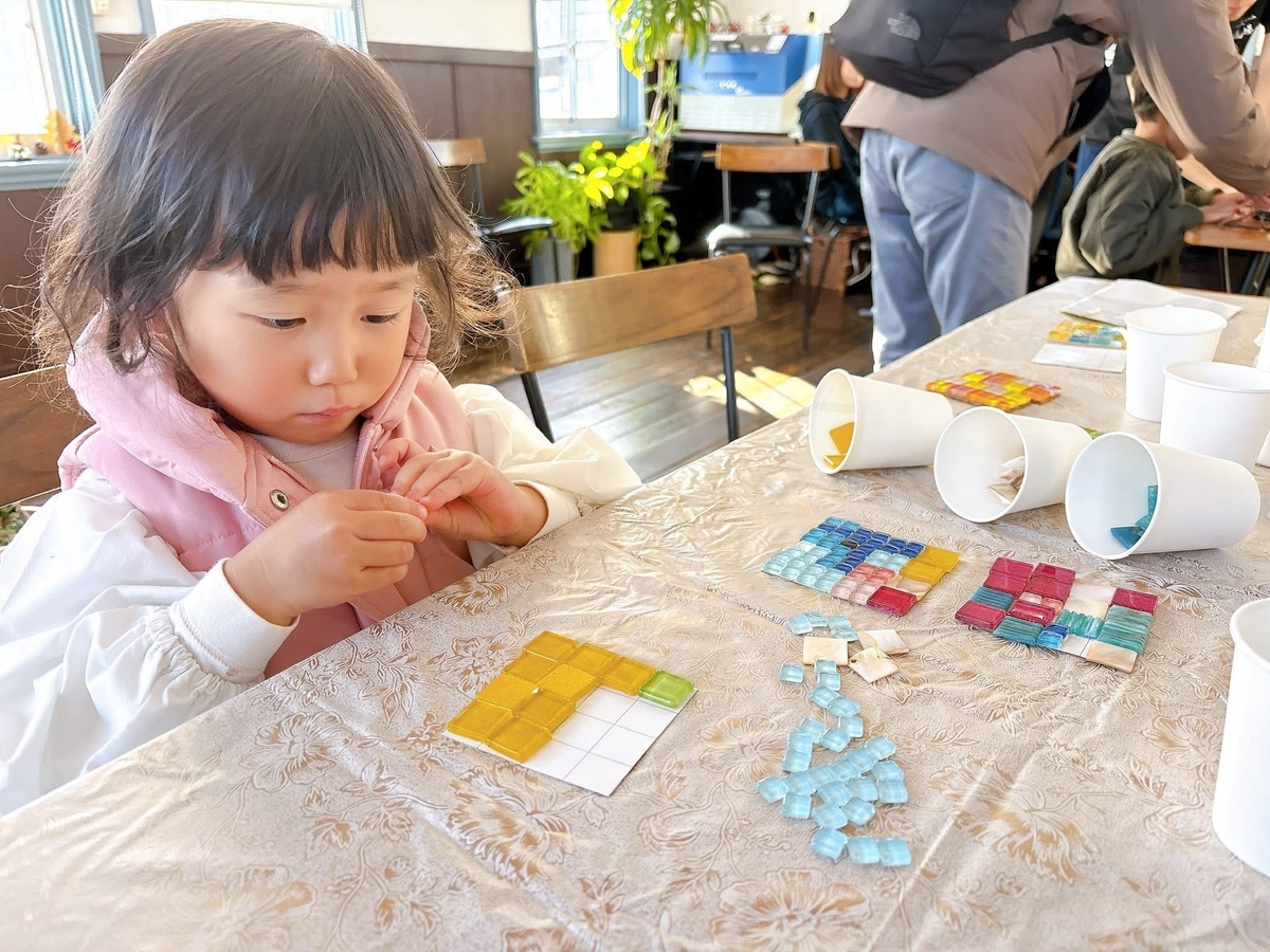 さて、午後に来てくれたこちらの女の子は、タイル並べにすっかり夢中になり、